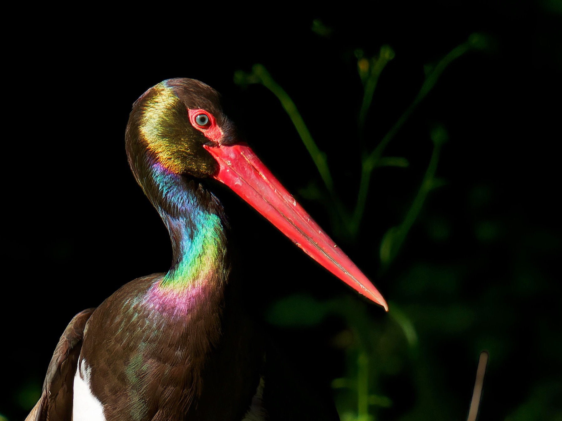 Le cou de la cigogne noire (Ciconia nigra) présente des reflets irisés, souvent verts, bleutés ou pourprés, surtout visibles à la lumière du soleil.