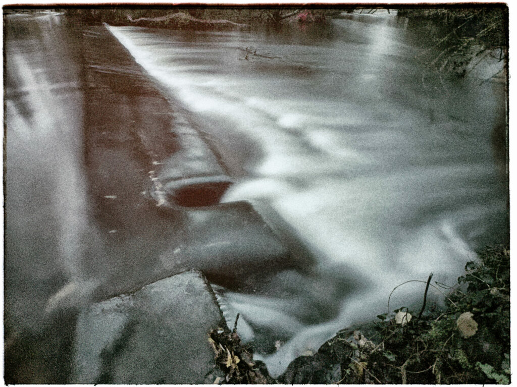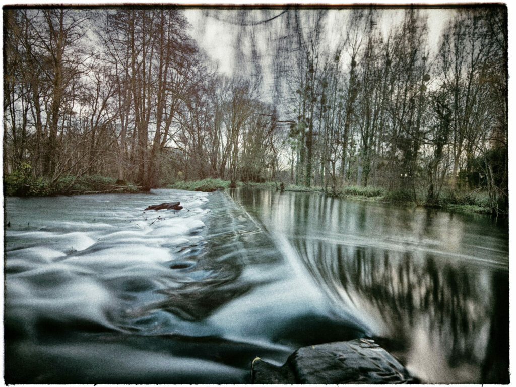 A Antezant La Chapelle, la rivière quitte son lit et s’étend dans la prairie. Une pose de 40 secondes (avec un filtre gris, sur pied) montre l’écoulement de l’eau. Un traitement type daguerréotype (Nik Analog Efex) apporte une touche de nostalgie à ce paysage hivernal.