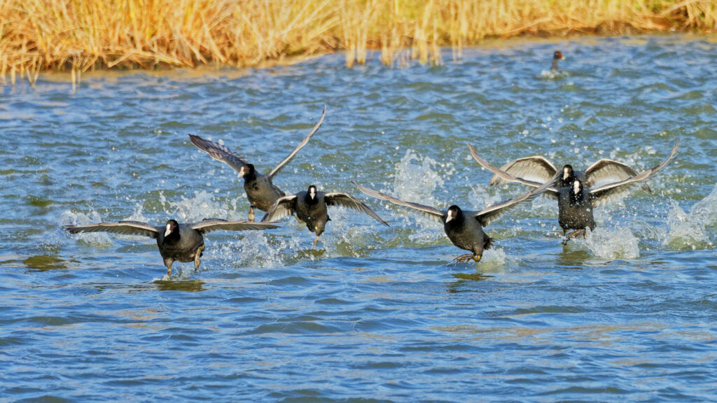 Grande poule d’eau qui s’envole en courant sur l’eau.