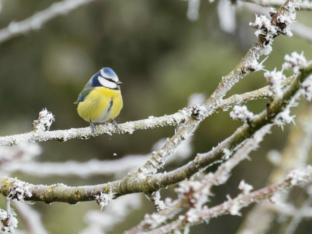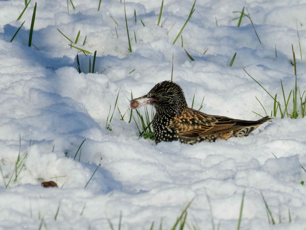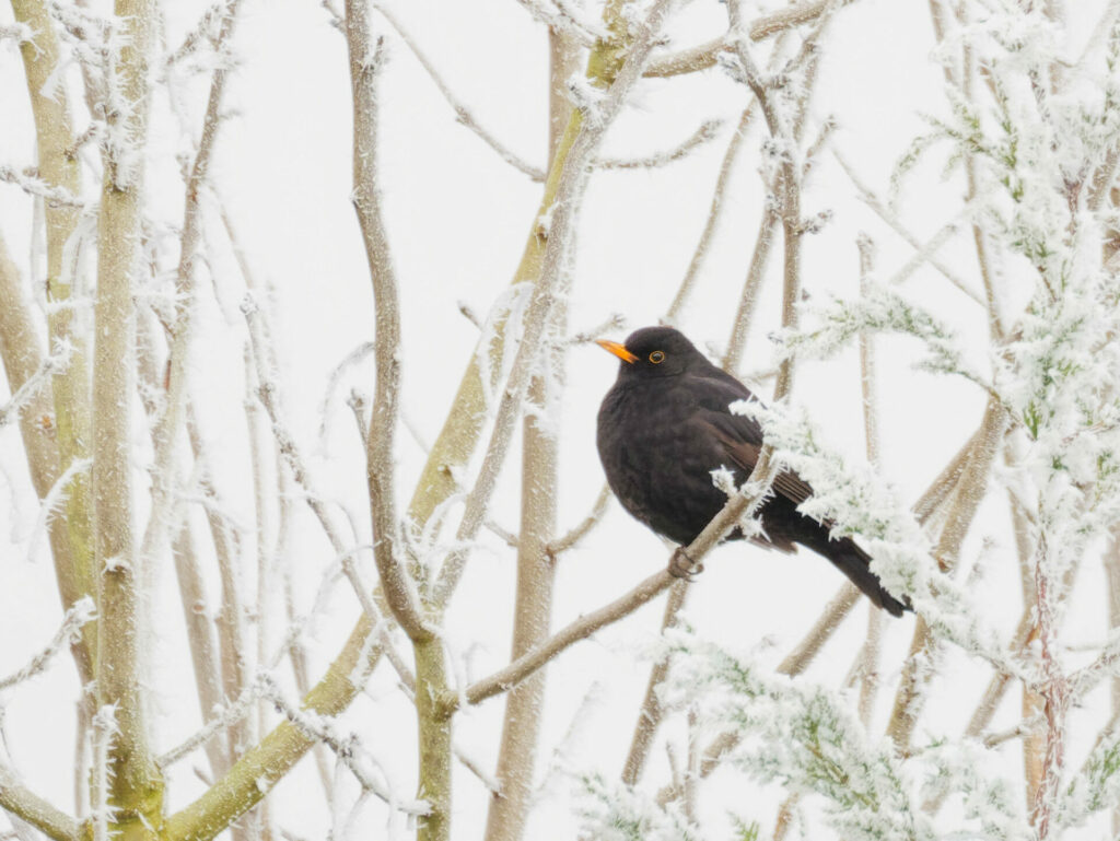Sur le cerisier enneigé et alentours, de nombreux oiseaux sont venus malgré la neige, se nourrir de graines de tournesol disposées à leur intention. Pinson des arbres, Mésange bleue, moineau domestique, rouge-gorge familier, grive musicienne, étourneau sansonnet.