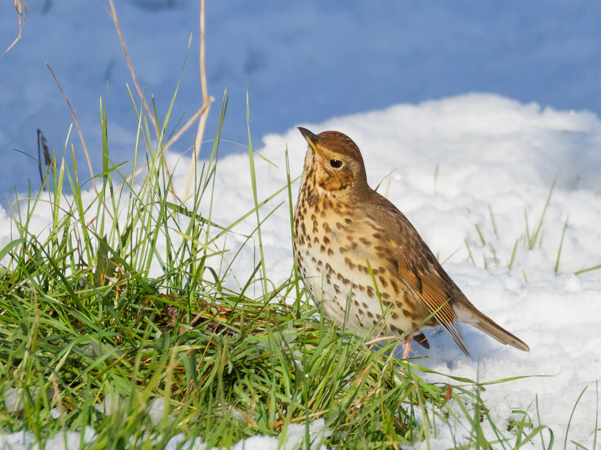 Sur le cerisier enneigé et alentours, de nombreux oiseaux sont venus malgré la neige, se nourrir de graines de tournesol disposées à leur intention. Pinson des arbres, Mésange bleue, moineau domestique, rouge-gorge familier, grive musicienne, étourneau sansonnet.