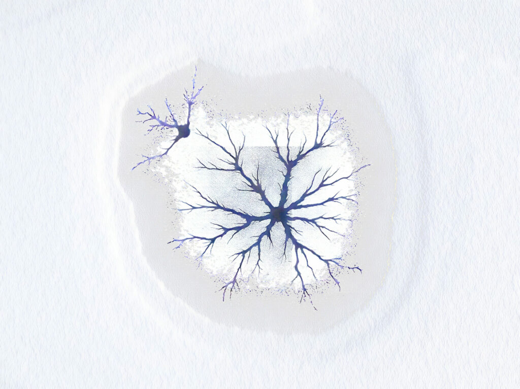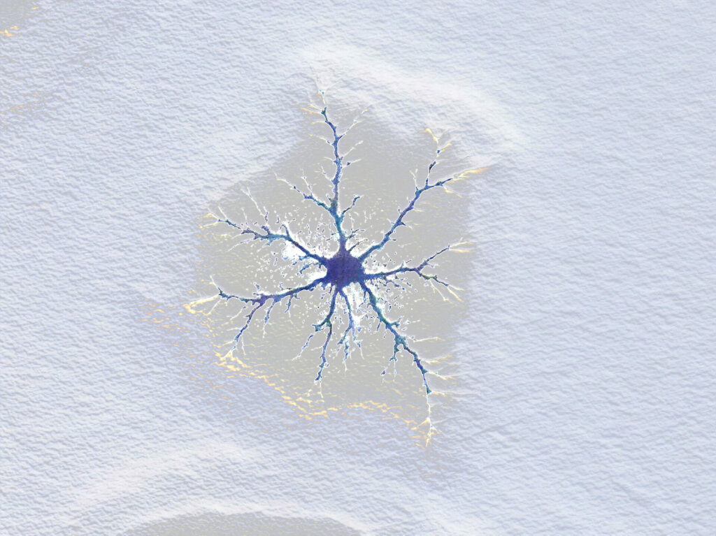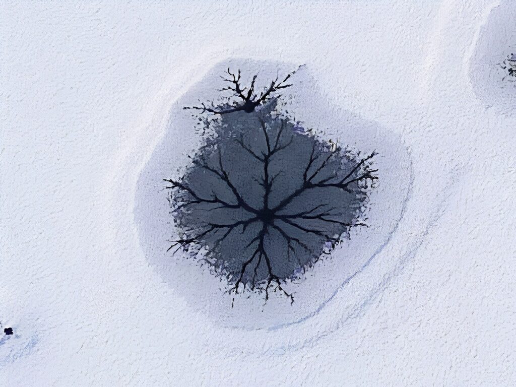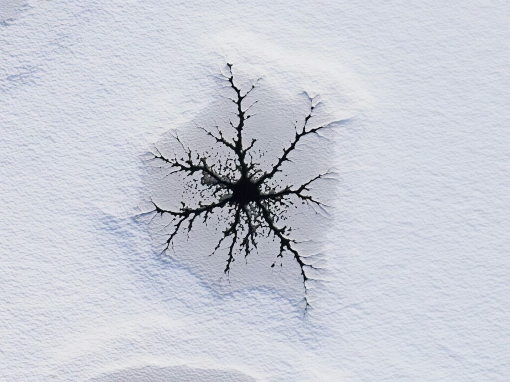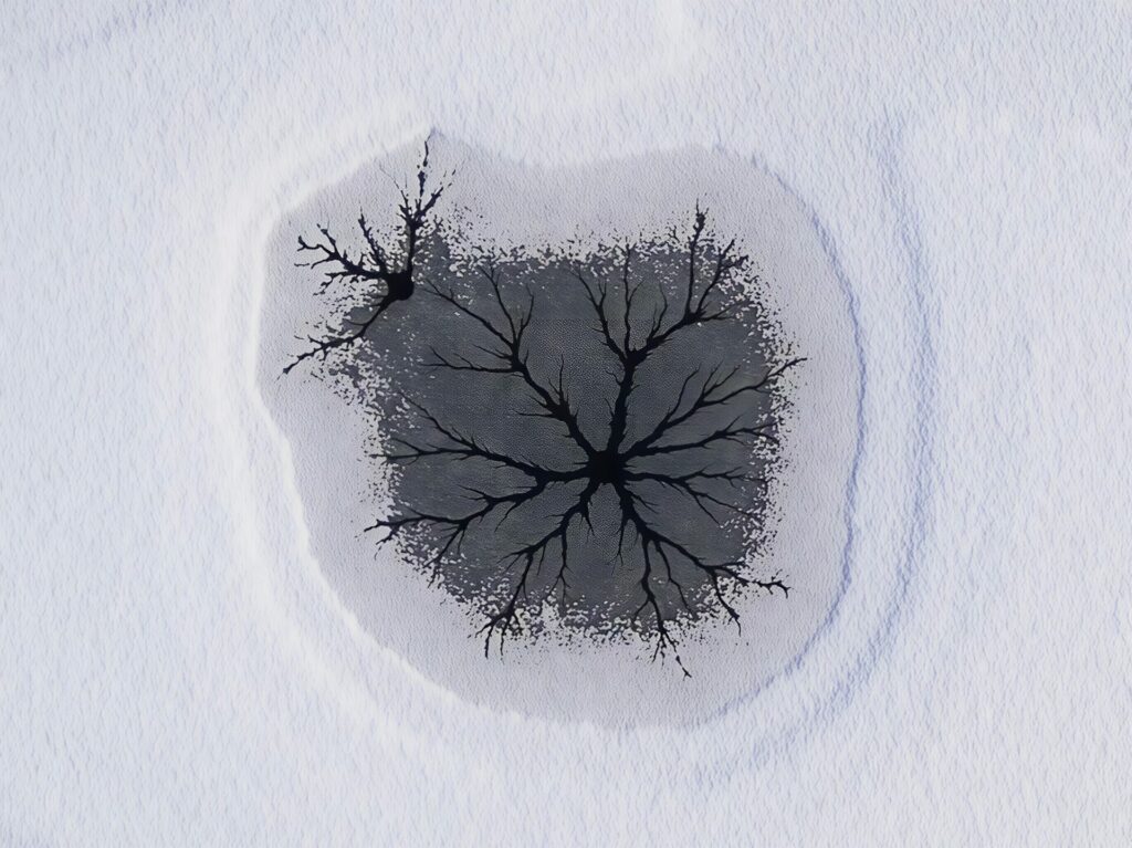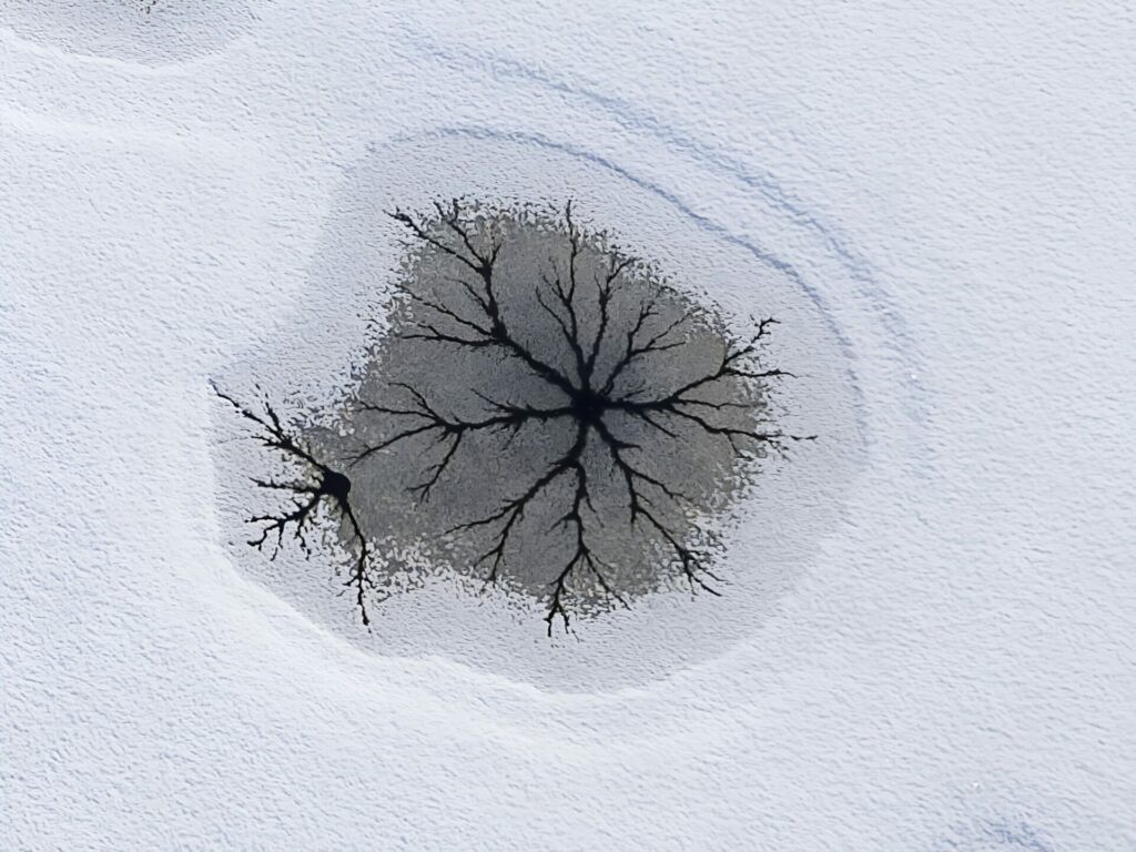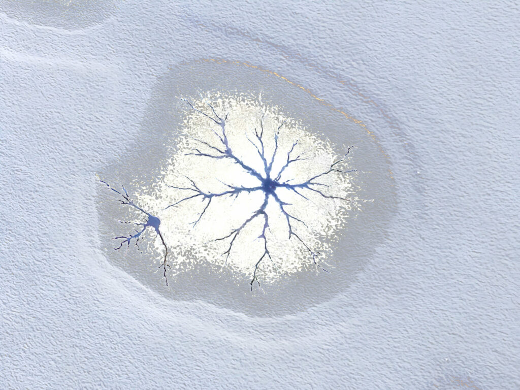 A la surface d’un étang gelé se sont formées des figures fractales de craquelures, photographiées en vue verticale avec mon drone puis corrigées par logiciel (Affinity).