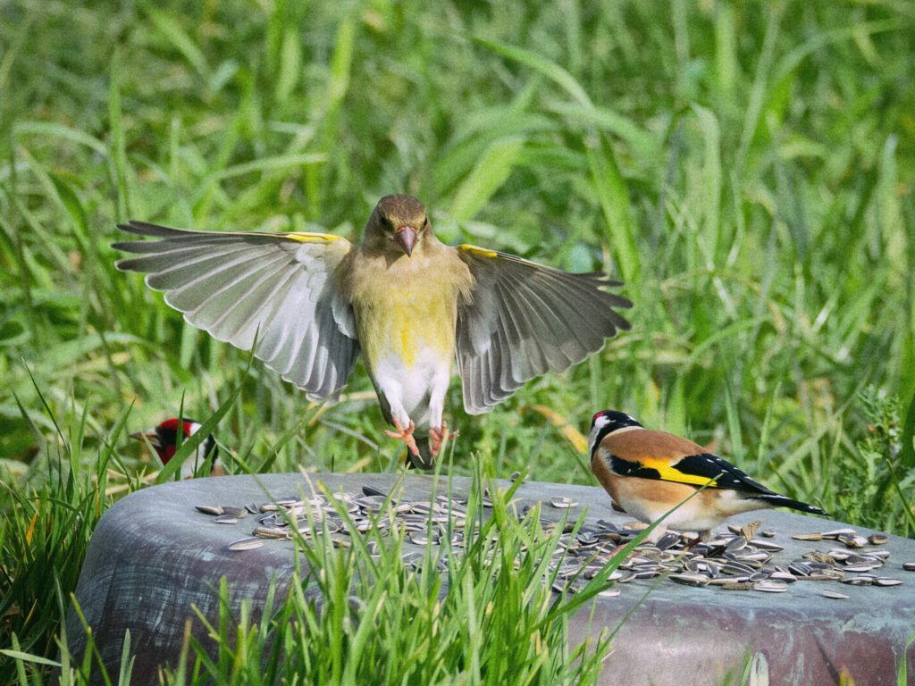 Encore un oiseau habituel des jardins, mais ailes déployées à l’atterrissage devant la mangeoire occupée par deux chardonnerets élégants dégustant des graines de tournesol.