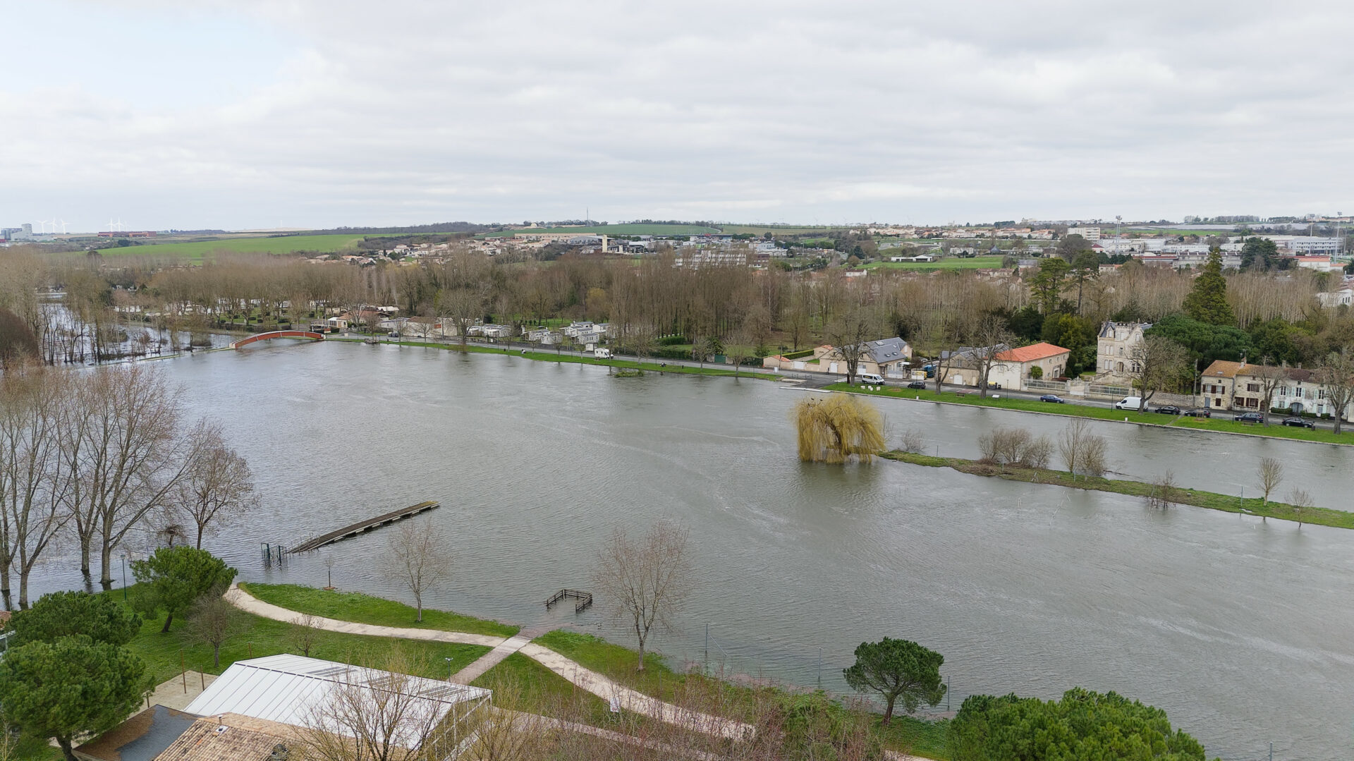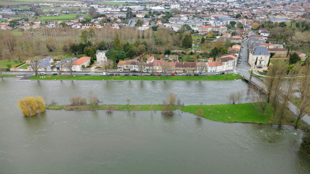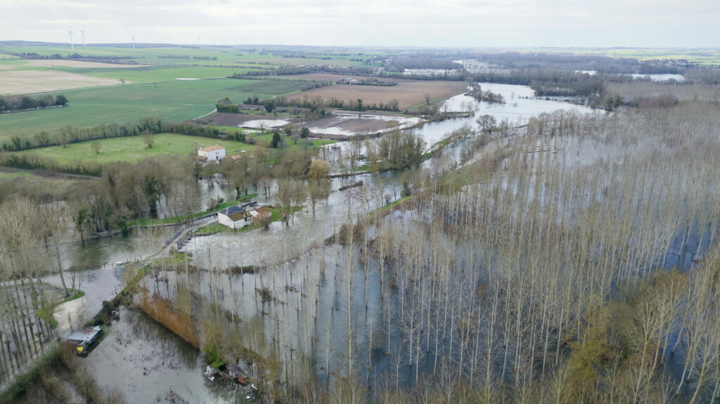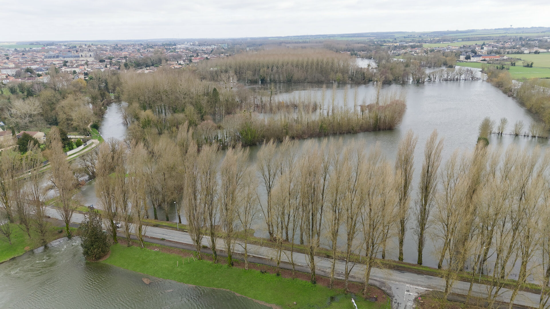 La rivière Boutonne est en crue depuis plusieurs jours, la tempête Niels et les fortes pluies n’arrangent pas la situation. Le drone permet de bien prendre conscience de l’importance de ce phénomène.