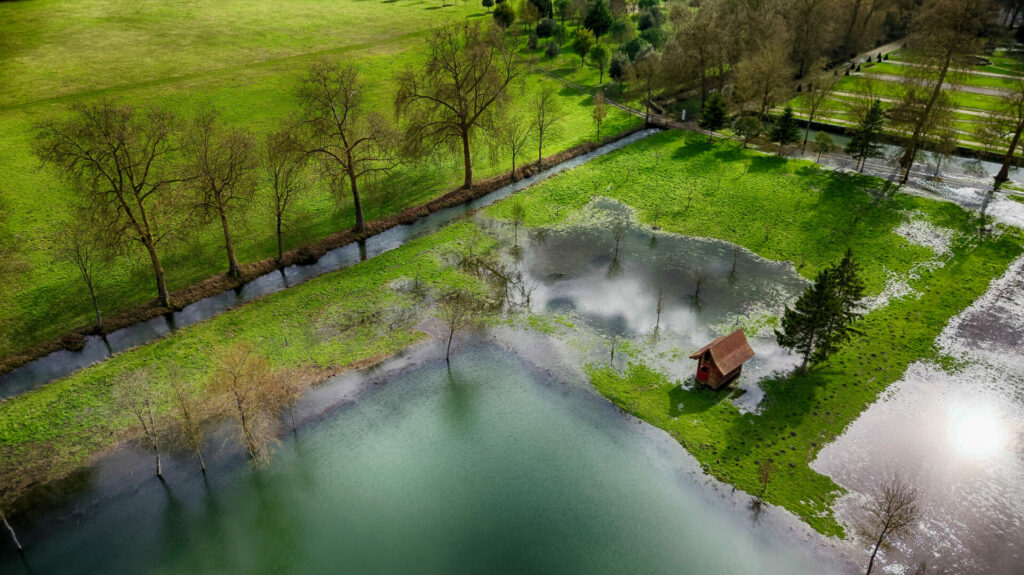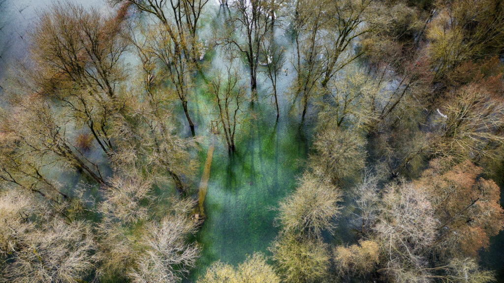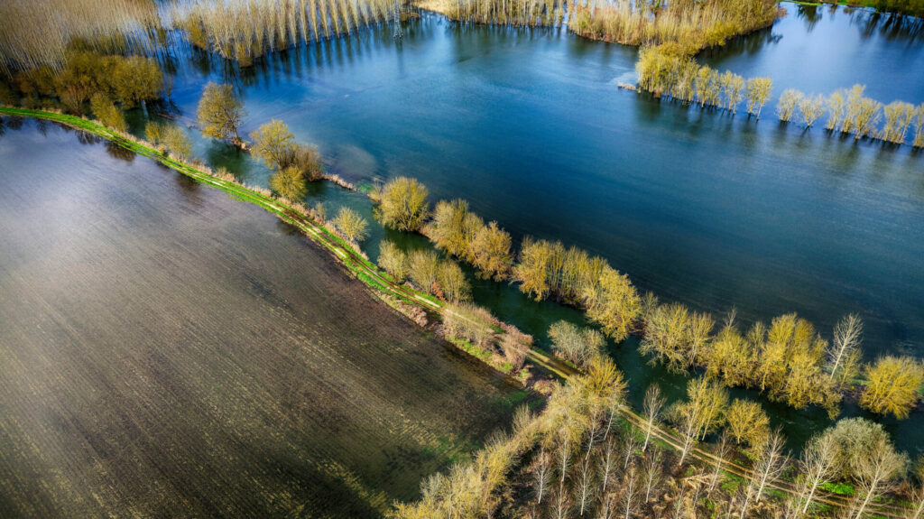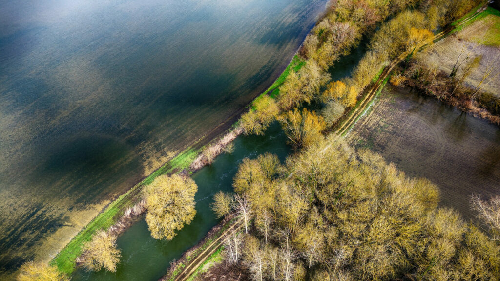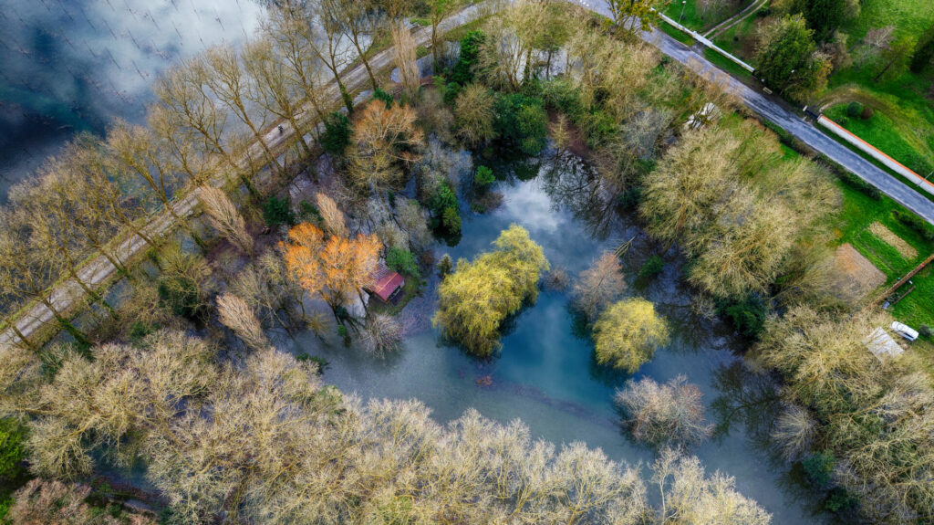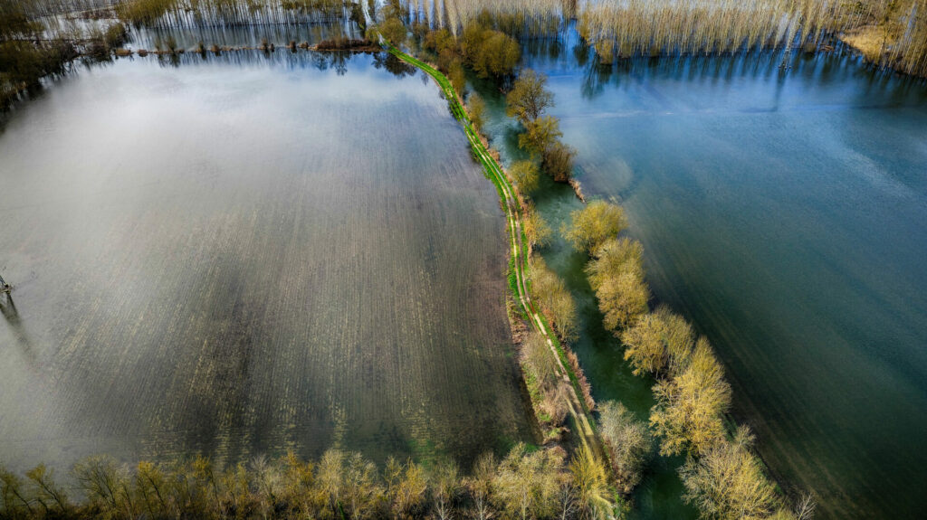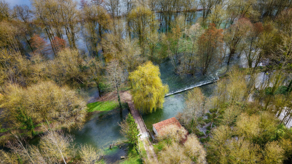 Le quartier de la sablière, à l’est de la ville, est sous l’eau et également la base de loisir d’Antezant La Chapelle, avec encore quelques chemins accessibles entre les étendues d’eau qui changent de couleur vues du ciel en fonction du sol sous jacent.