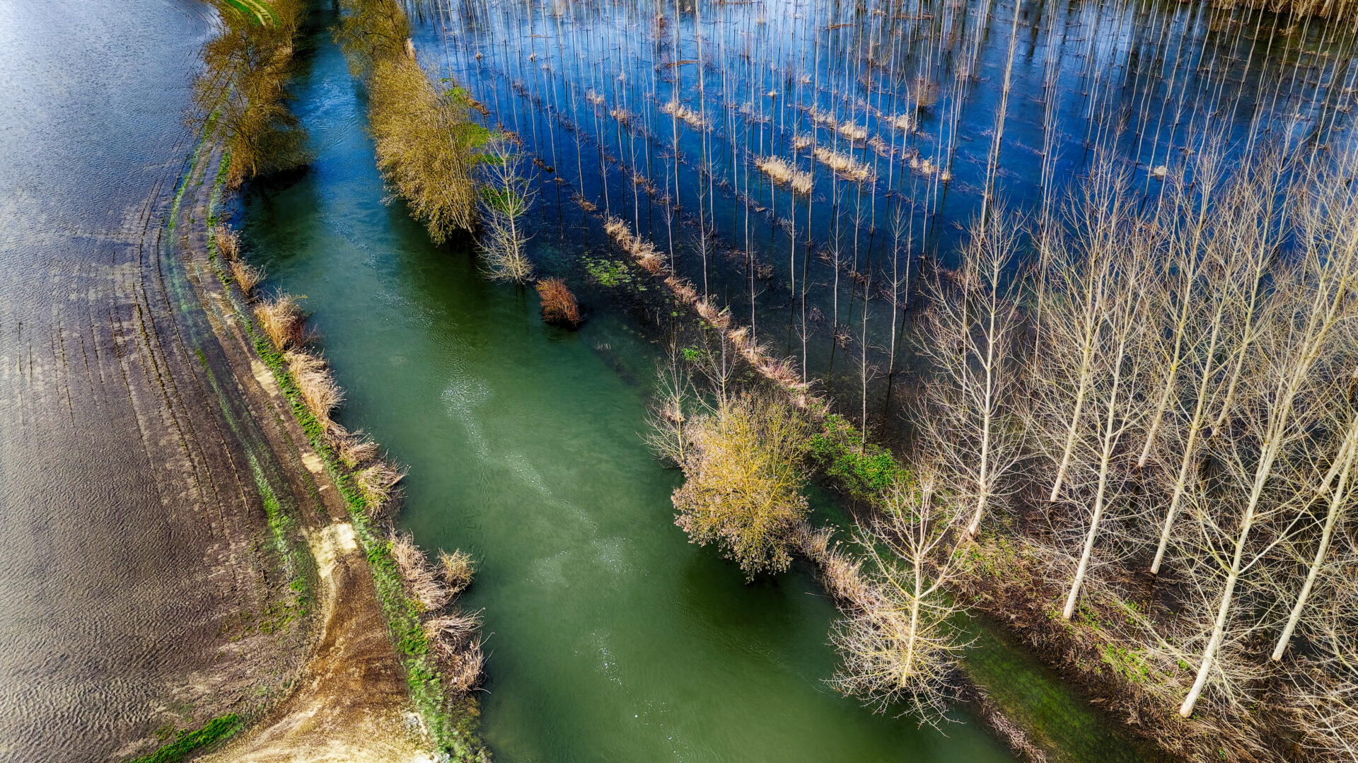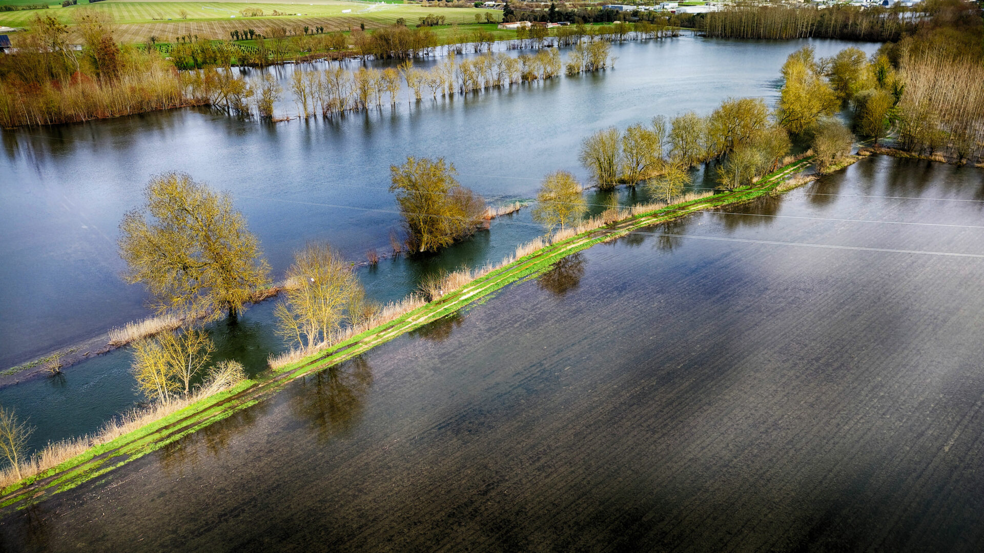 Le quartier de la sablière, à l’est de la ville, est sous l’eau et également la base de loisir d’Antezant La Chapelle, avec encore quelques chemins accessibles entre les étendues d’eau qui changent de couleur vues du ciel en fonction du sol sous jacent.