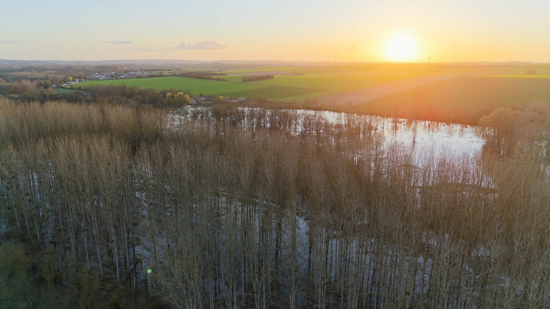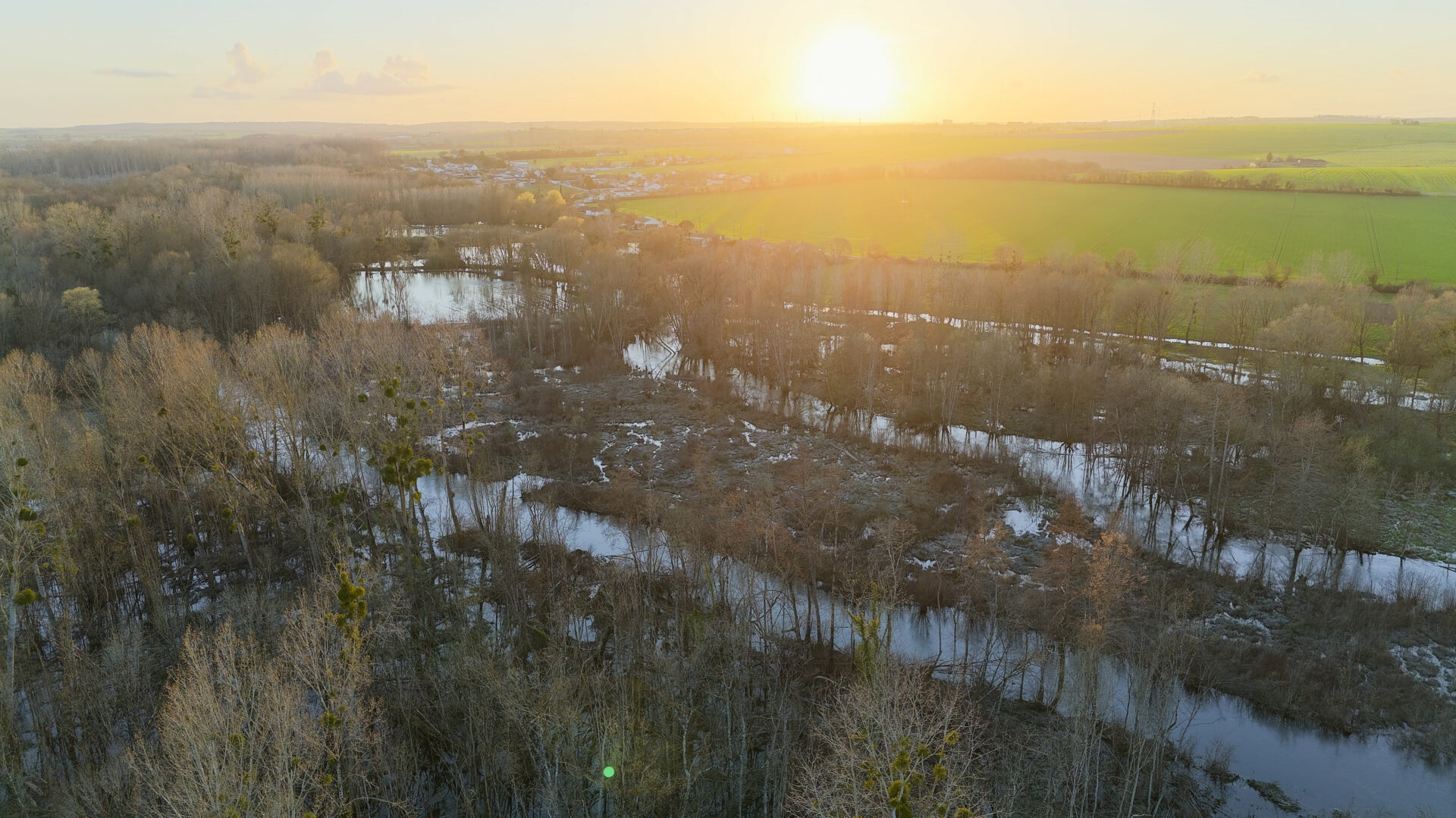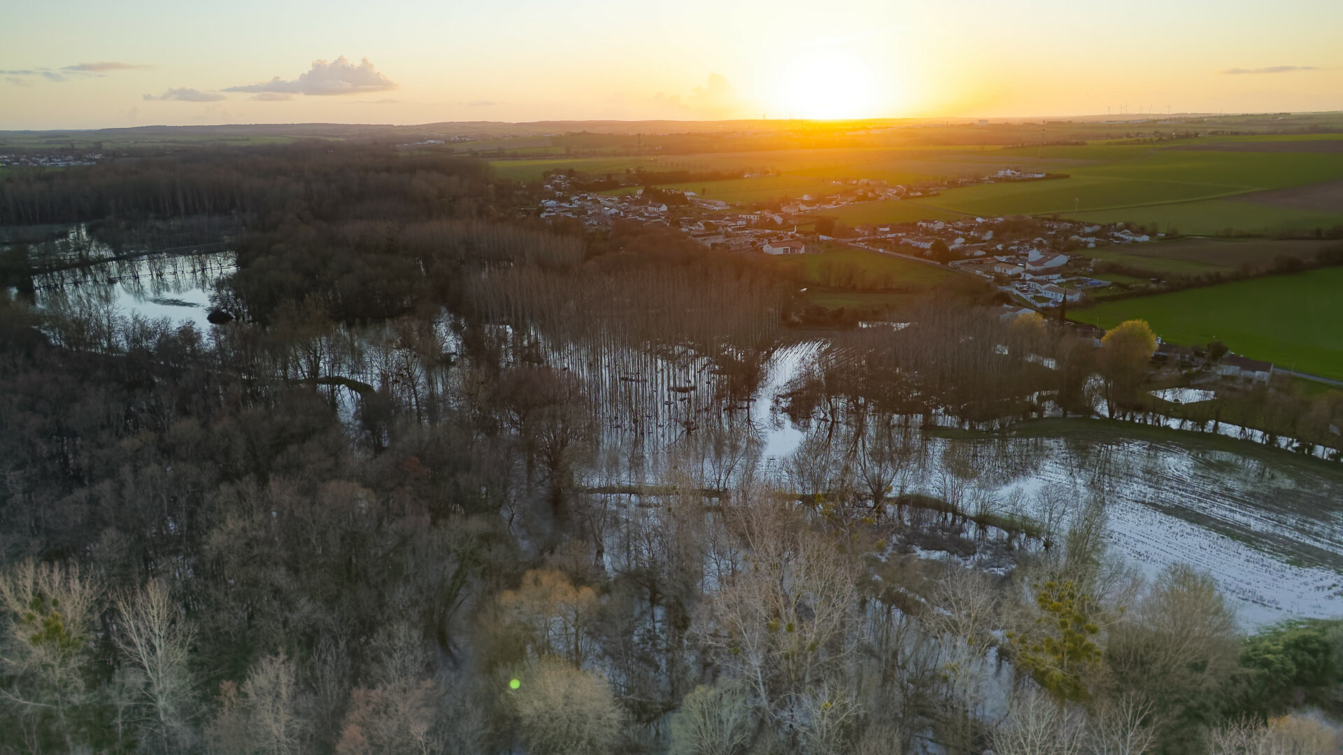 Petit village au nord de Saint Jean d’Angely qui n’a pas été épargné par la crue de la Boutonne. Survol par drone au coucher du soleil.
